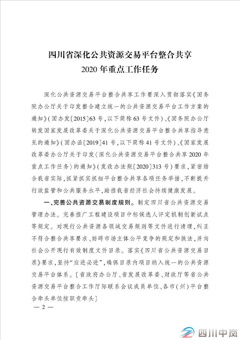 四川省人民政府辦公廳關(guān)于印發(fā)《四川省深化公共資源交易平臺整合共享2020年重點(diǎn)工作任務(wù)》的通知